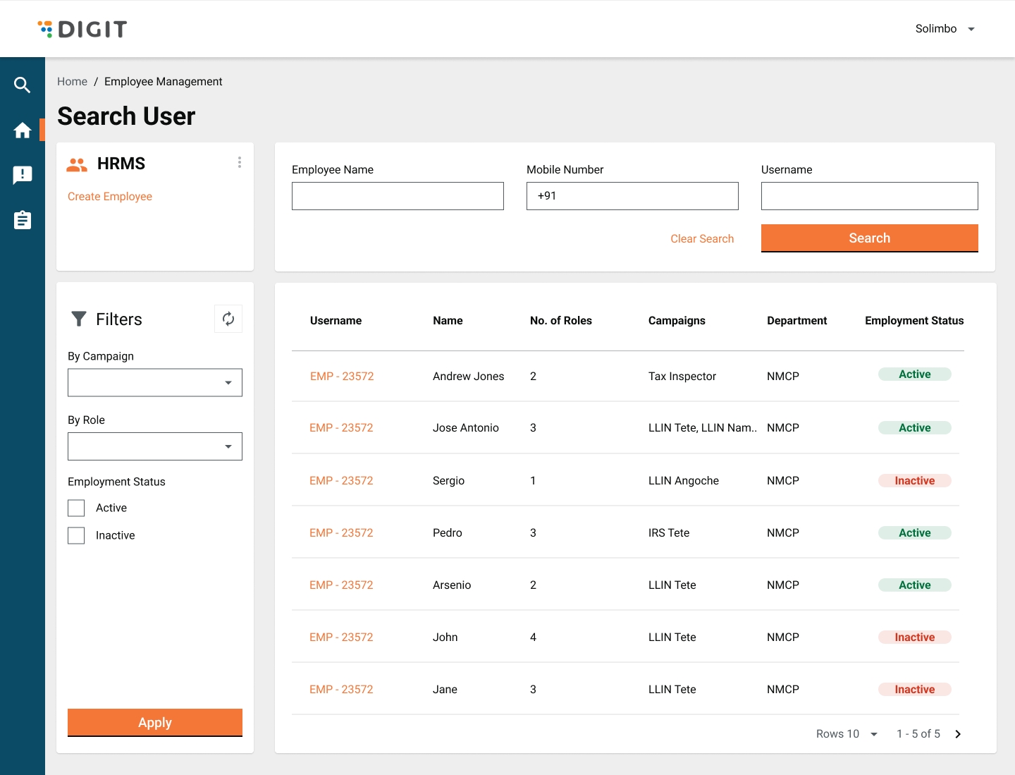 A user must be able to search for an existing employee using search parameters (name, mobile number, username).