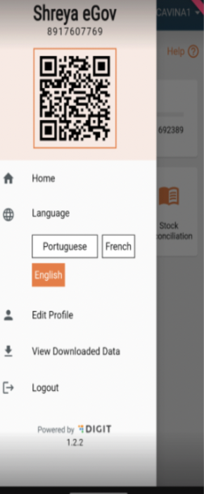 After clicking on the hamburger button, a list of actions appears on the user screen. The top displays the user name and contact number, followed by other options such as the home button, language select, edit profile, projects, and logout.