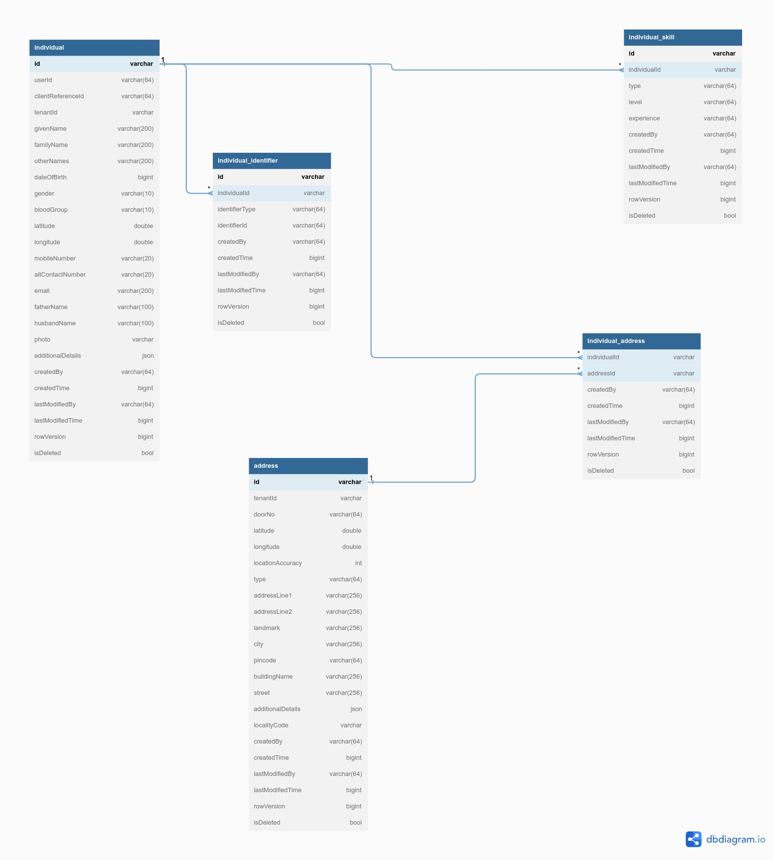 The source code for an Individual is present in the health-campaign-services Git repo. The spring boot application needs the Lombok* extension added to the IDE to load it. Once the application is up and running, the API requests can be posted to the URL and the IDs can be generated.