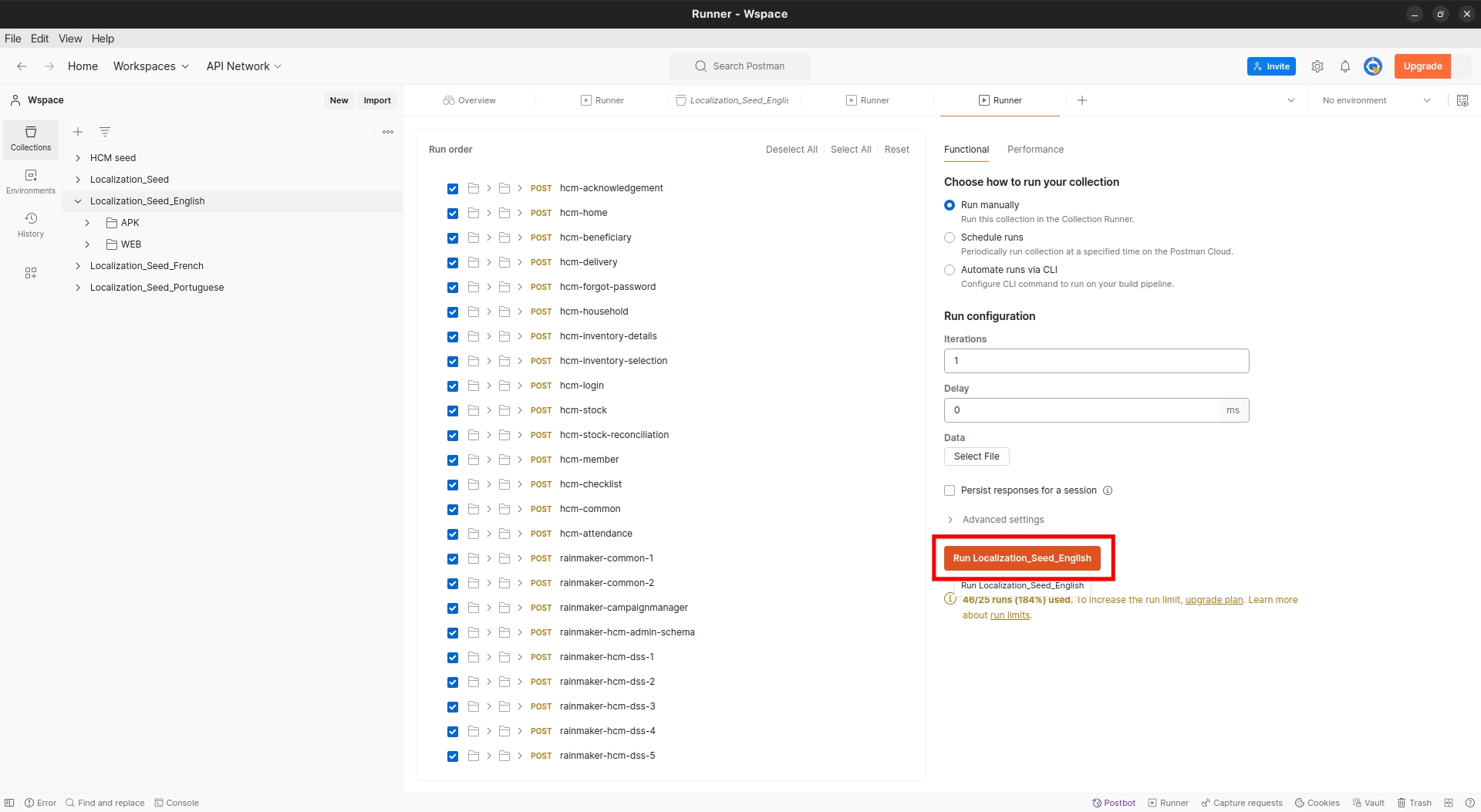 Import the downloaded file into Postman and select all language localisation collections and click on run. See the screenshot below for reference: