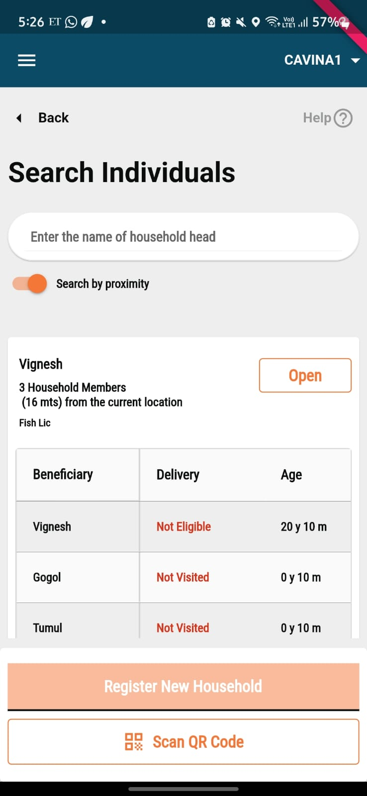 When revisiting the house, the house details should be listed by proximity calculated based on the GPS coordinate captured. The name of the household head should be displayed if it was captured.