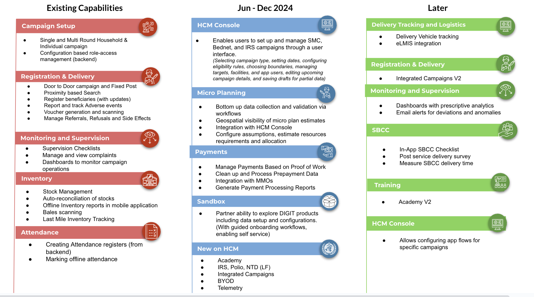HCM is designed with highly configurable, reusable modular building blocks, enabling rapid reconfiguration of the same product for different health campaigns. These modules can also be repurposed to develop new solutions for routine health, primary healthcare, and other areas.