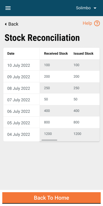 After successful login, a user lands on the home screen, which consists Stock Reconciliation". When the user clicks on the stock reconciliation button on the home screen, he/she is navigated to this screen where they need to verify whether the physical count and calculated stock values are the same or not.