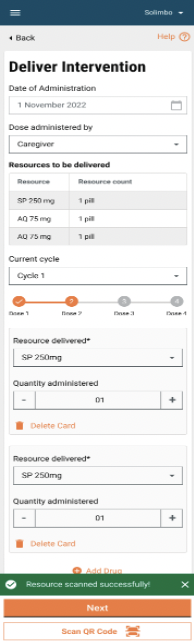 The scanner screen has an expandable card that provides the list of resources scanned. The card displays the count of resources scanned along with the identification number for each scanned resource. If one is unable to scan, the user can enter the codes manually, but after every code, he/she must click on the enter beneficiary code again and repeat the process. The user can remove any resource by the help of the delete button provided against each resource. Once scanned, the user must click on the submit button which brings him back to the deliver intervention screen. The toast message for successful scan is displayed on the screen.