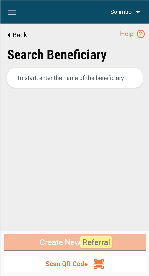 When the user clicks on the “Beneficiary Referral” button in the previous screen, the user will be taken to the “Search Beneficiary” screen where he/she can search for a given beneficiary by their name or a QR code voucher provided to the beneficiary.