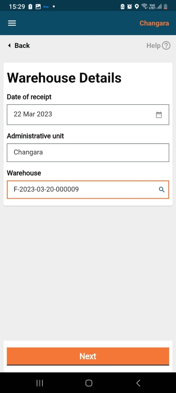 When a user clicks on record stock receipt, the warehouse details screen will appear.