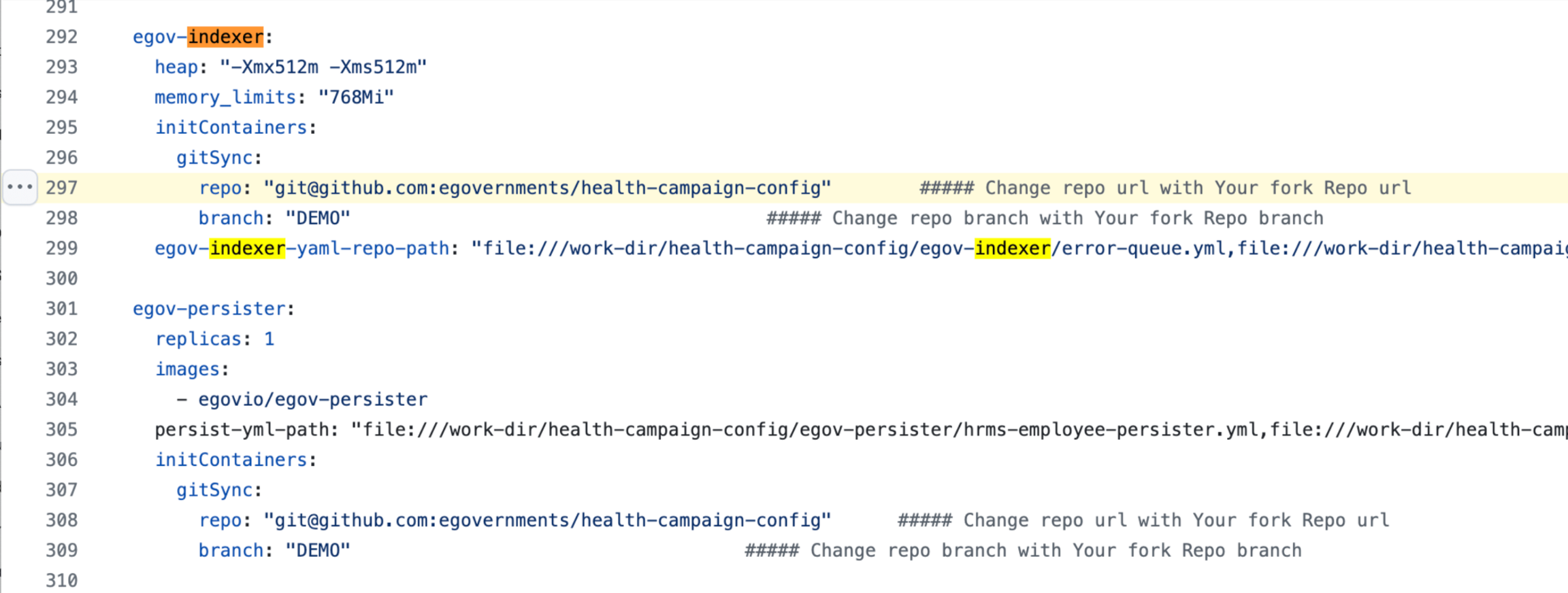 Under the egov-indexer: change the gitsync link of the health-campaign-config repository to the forked config repository and the branch to DEMO.