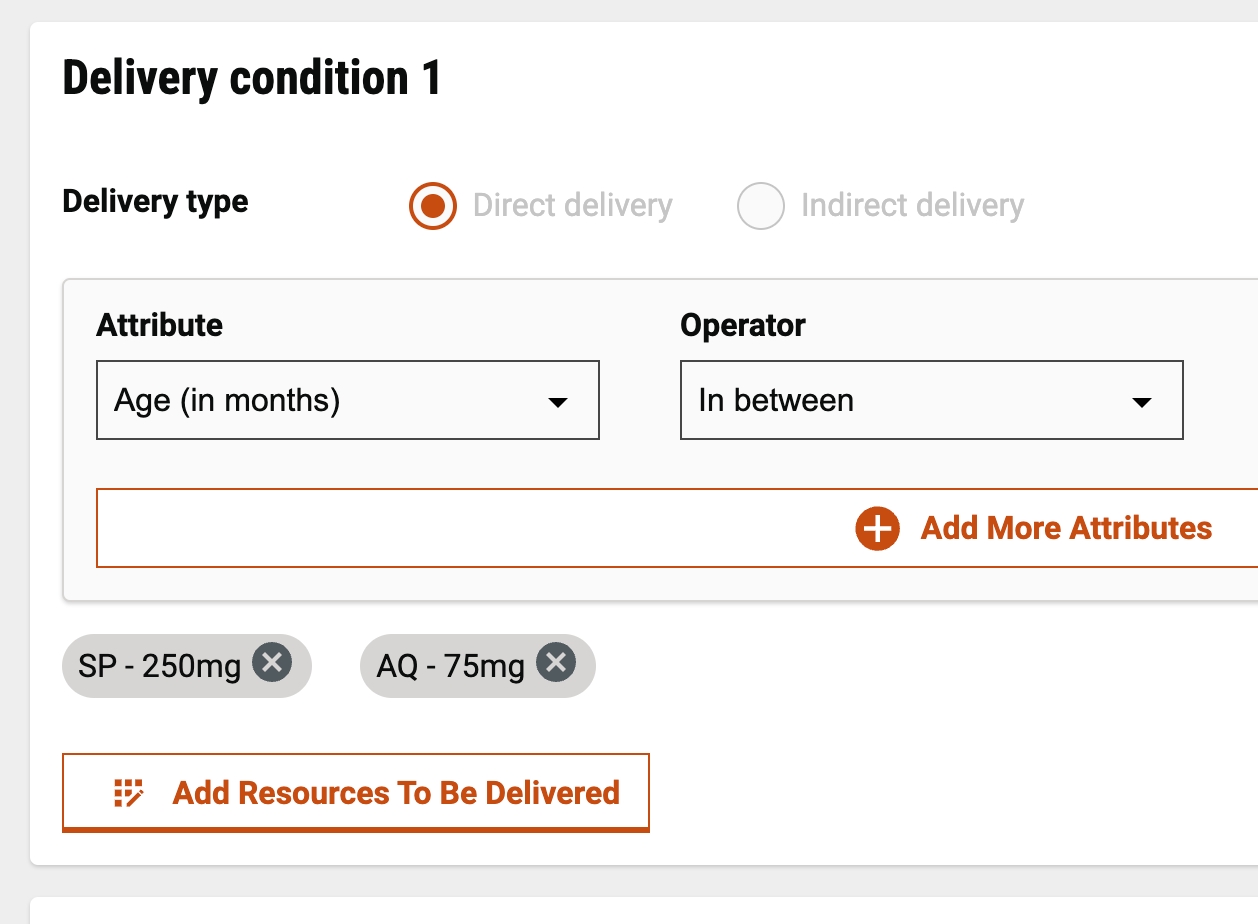 Create new products and use them when configuring delivery rules. Avoid using default values in the quick setup flow. Delete the default resources, click on "Add Resources," and then select the items you want to deliver.