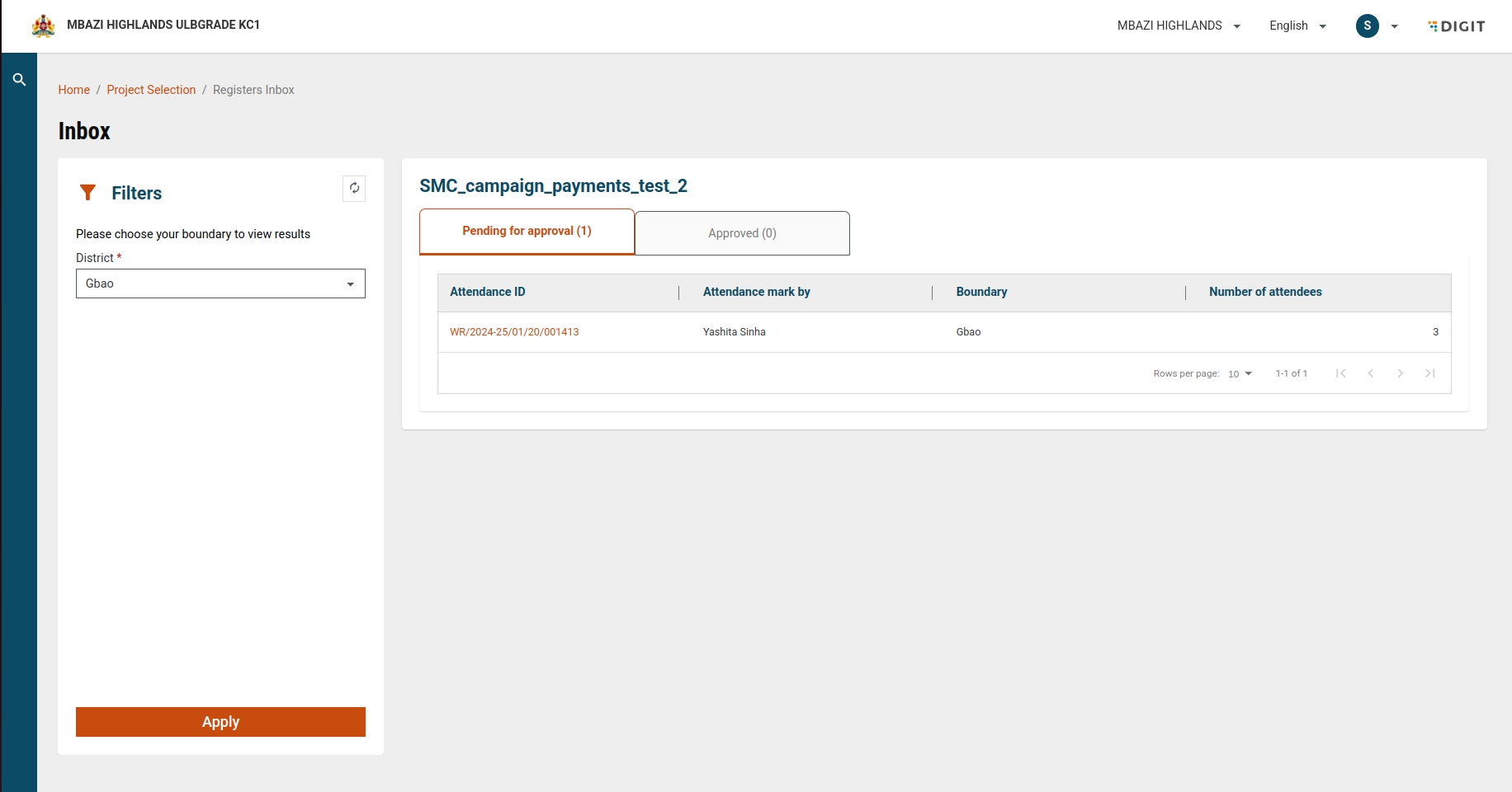 Registers Inbox: Displays filtered attendance registers for selected boundaries.