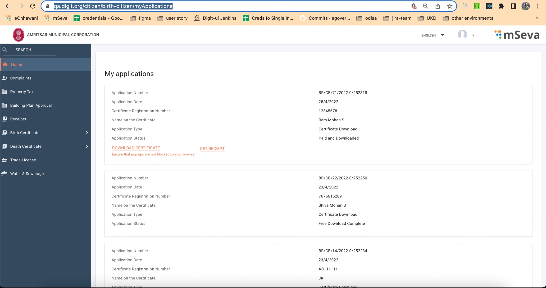 Citizens can download certificates and receipts from the My Applications screen.
