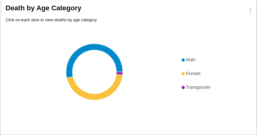 Deaths by Gender: This will be a split bar graph where total deaths registered will be bifurcated by age category (< 2 years, 2-15, 15-29, 30-44, 45-59, 60-74, >= 75) and each bar will show gender wise split