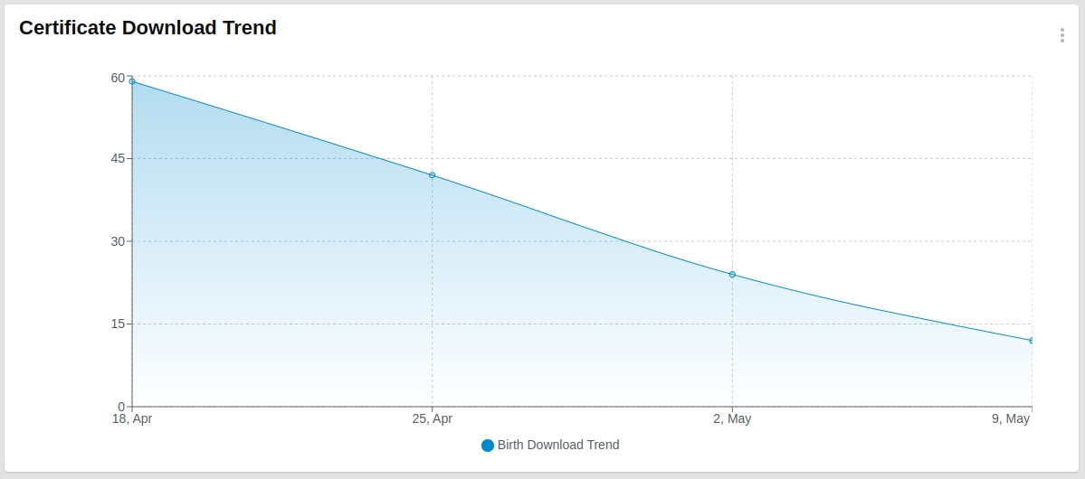 Certificates Download Trend: A line graph that shows the total death certificates downloaded for a given month, and the total death Certificates downloaded for the applied date filter.