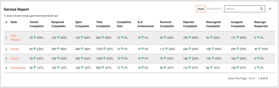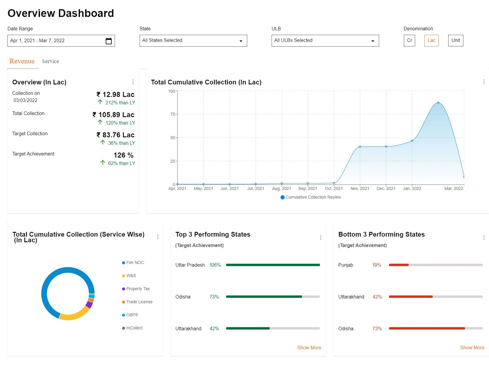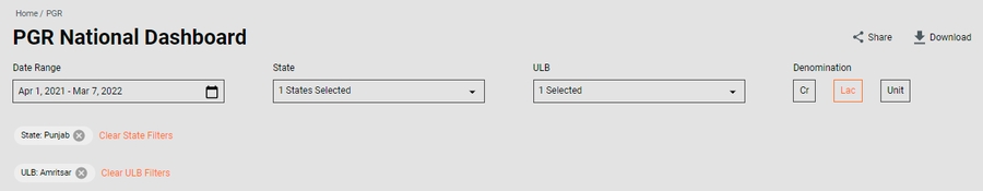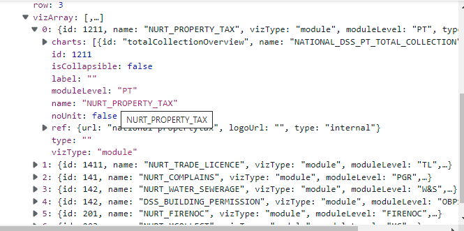 Module Level card: Clicking on the Module level card, redirects users to the Module level dashboards. vizType is module (i.e Property Tax, Trade License etc).