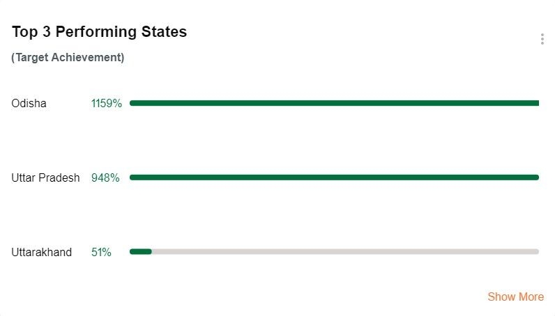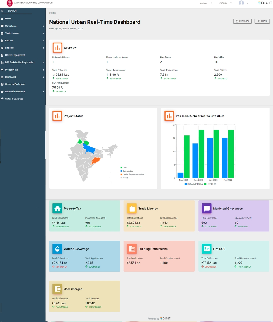 Map chart: This entity displays the total, active ULBs within states where DIGIT is live.