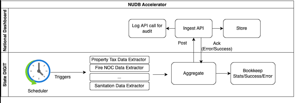 A national dashboard adaptor extracts data from the state DSS at a scheduled time which can be configured and then would ingest in the National Dashboard. The adaptor ingests data at the state/ULB/Ward level for each module on a daily basis. The adapter sends the data in a batch size of 50 to the national dashboard.
