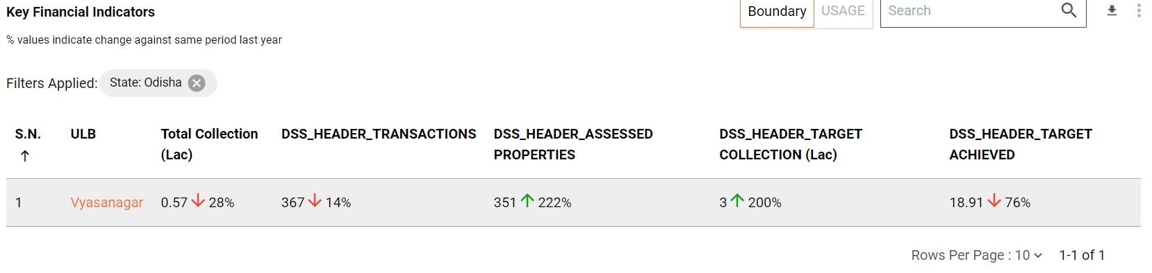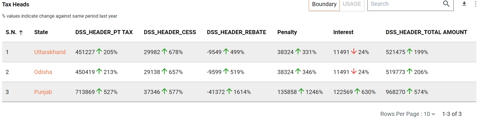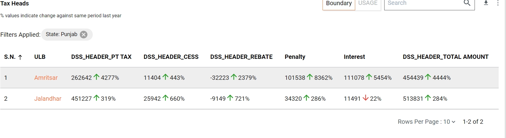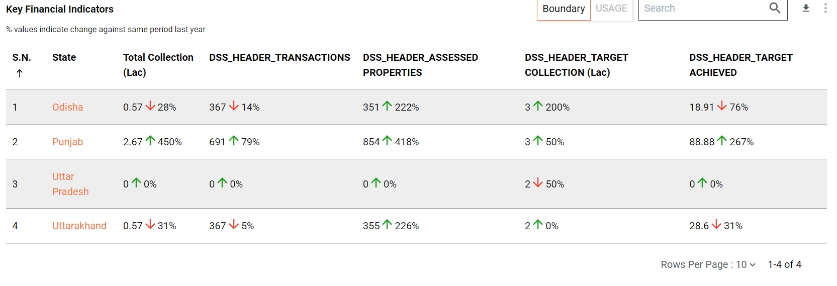 Boundary - This tabular chart representation graph shows multiple PT information like Total Collection, Penalty, Interest etc. And this table shows the data at the State level and also has the drill-down chart for each State to ULB and from ULB to ward level data for the same.