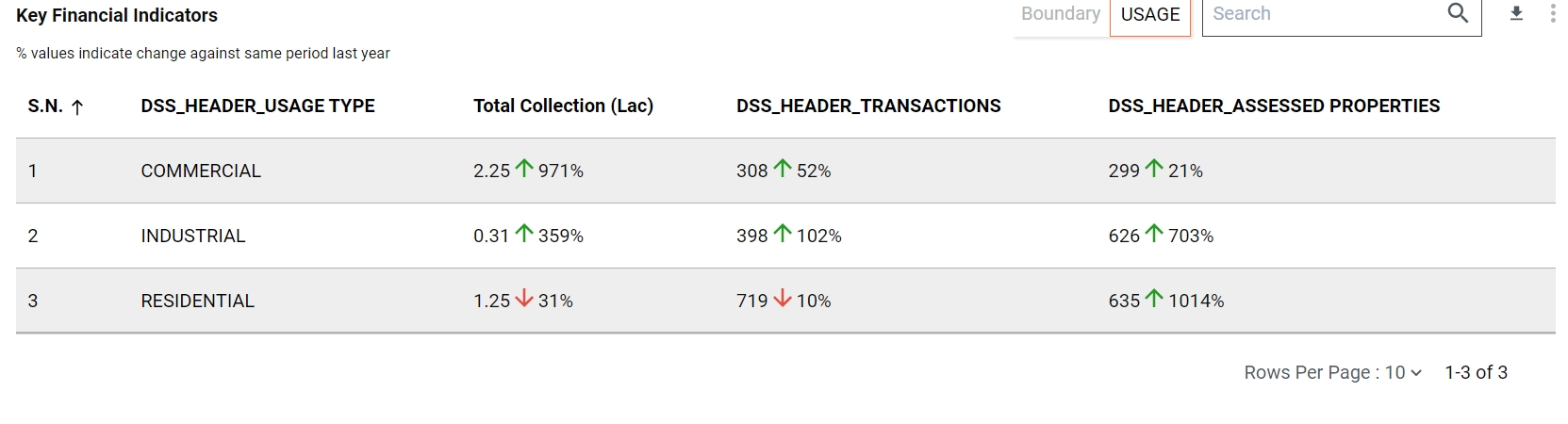Usage - shows the data in the form of connection type for the given time period. Usage Type, Total Collection, Transactions, Assessed Properties.