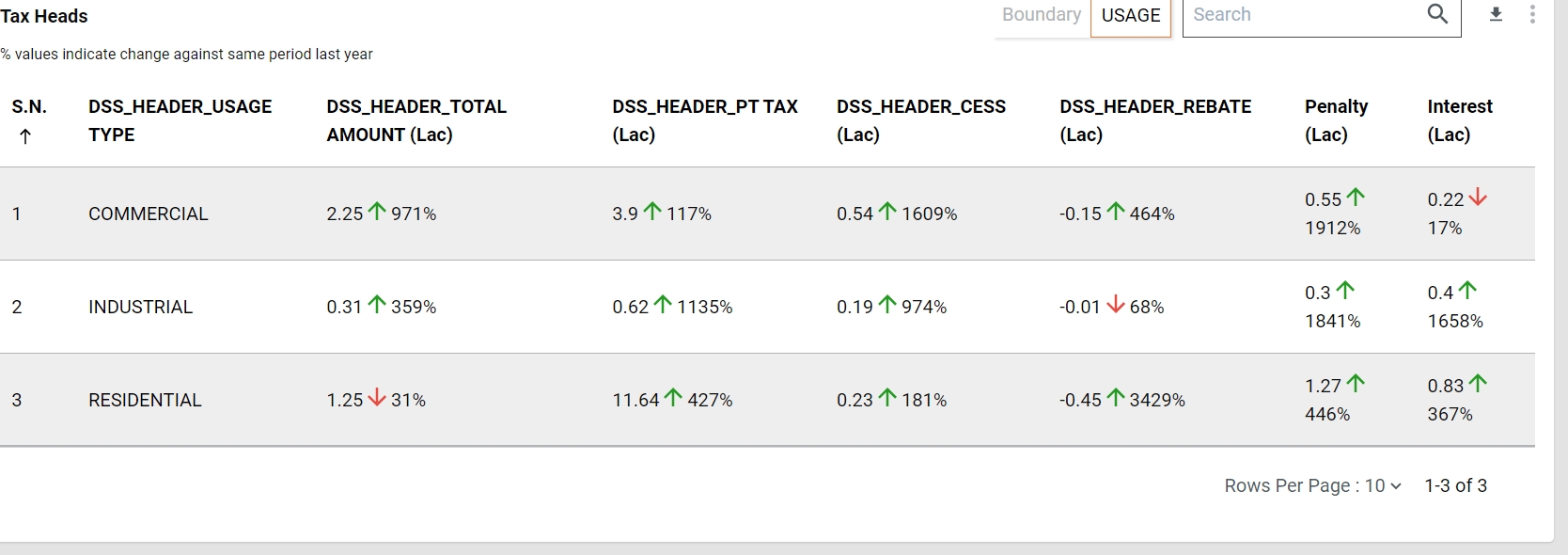 Usage - shows the data in form of Connection type for the given time period. Usage Type, Total Amount,Tax, Cess, Rebate, Penalty, Interest.