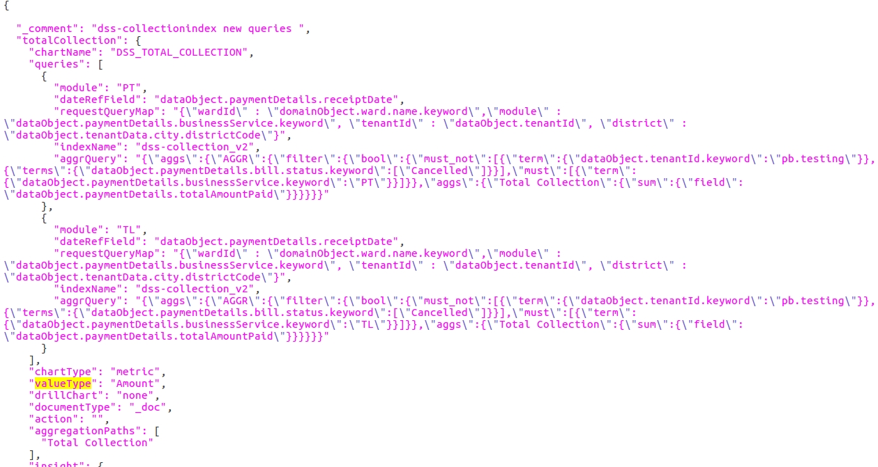 To add a new chart, chartApiConf.json has to be modified as shown below. A new chartid (key of the JSON) has to be added to the chart node object. The chartid JSON contains the chart name, chart type, valueType, documentType, aggregationPaths and queries attribute.