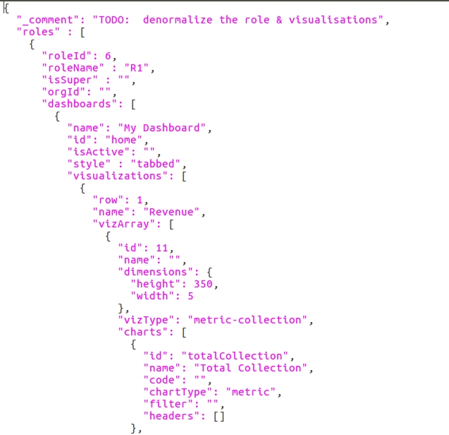 Add the new JSON object in the dashboards array. Add the dashboard name in the name attribute, Id should be unique, which is used for assigning a role for the dashboard. We will talk about visualizations below.
