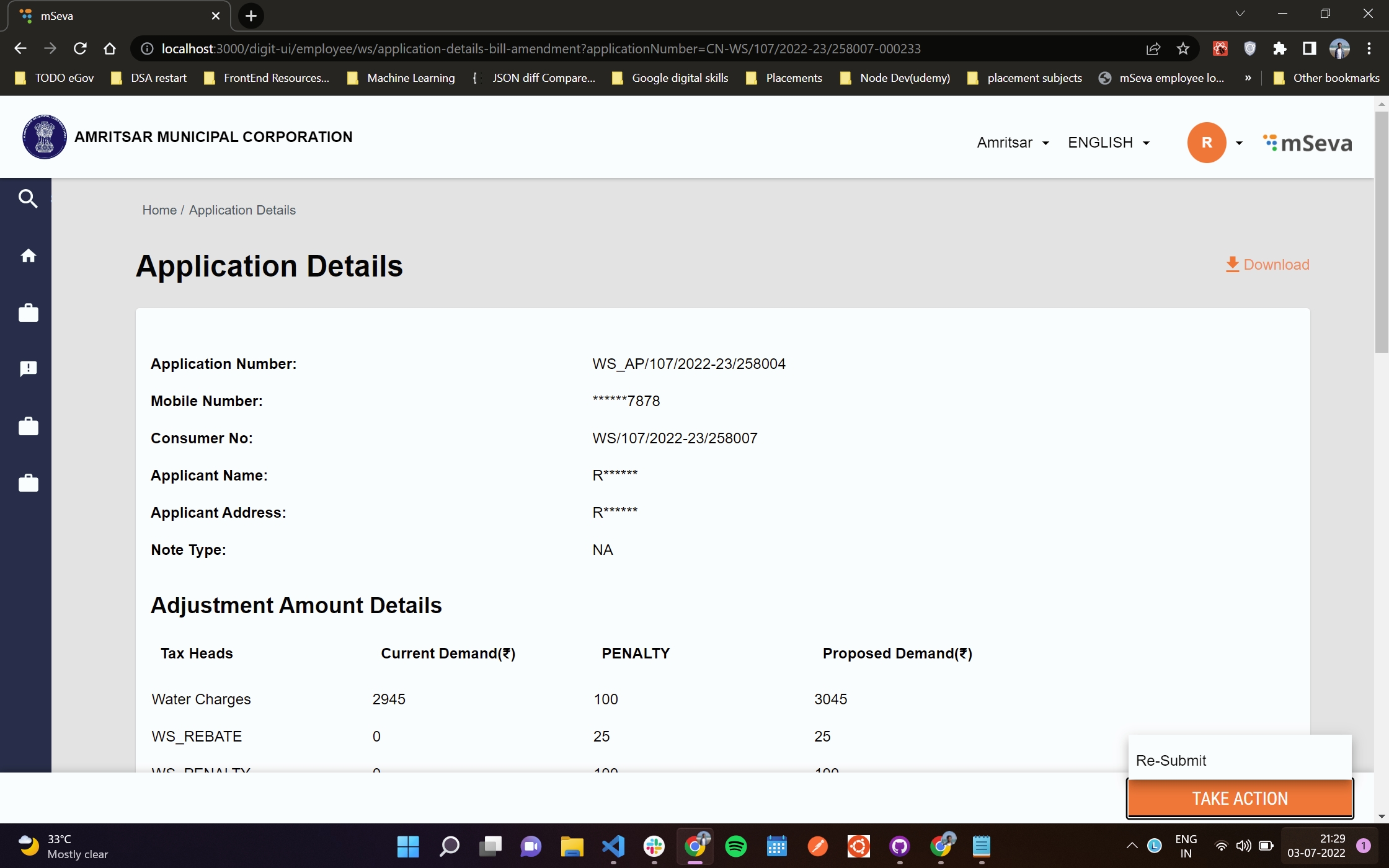 The Application Details page of the bill amendment contains the Take Action button on the action bar at the bottom of the screen. The Take Action button opens a dropdown that contains some options described below. After clicking any of the given options an Action modal window is rendered.