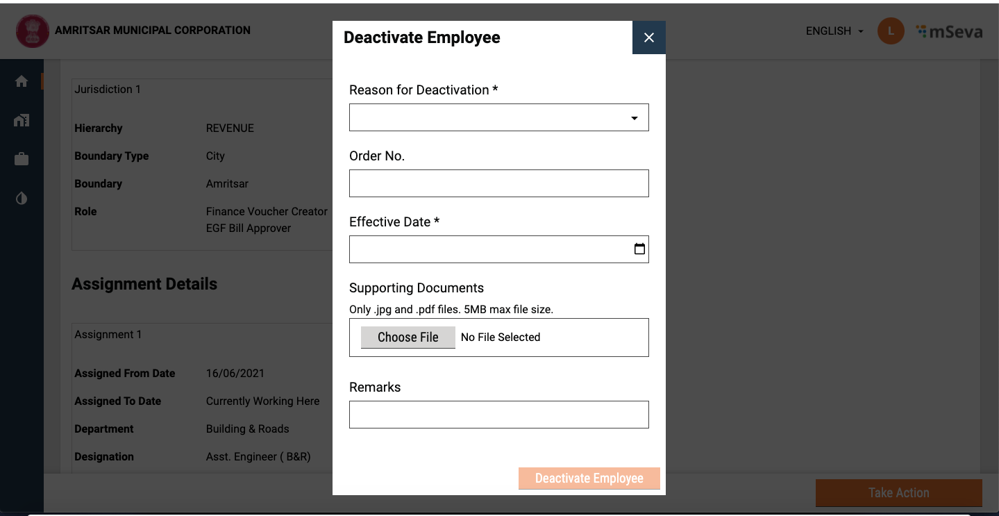 On the click of Deactivate Employee button, a popup appears where users should provide necessary details such as