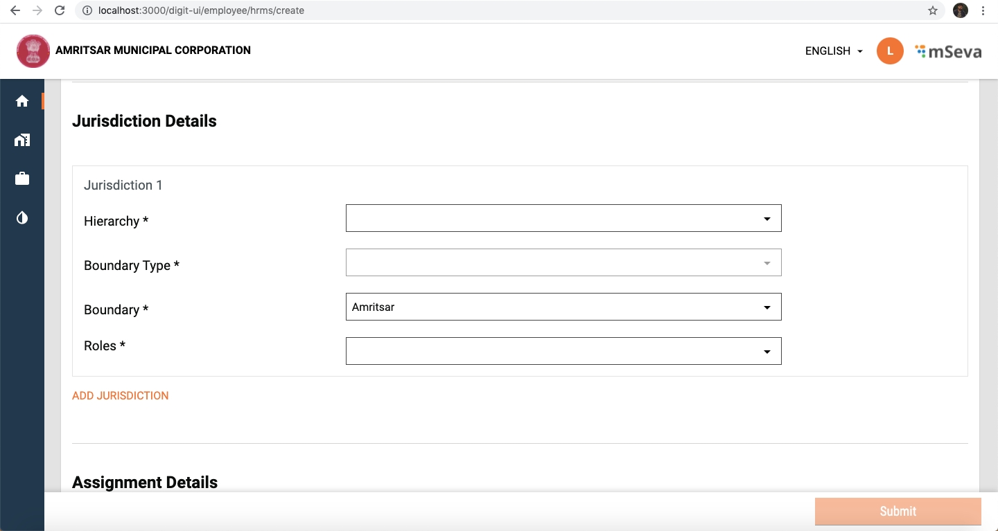 The Boundary is auto-filled with current TenantId. The user is able to add Multiple Jurisdictions and Assignments.