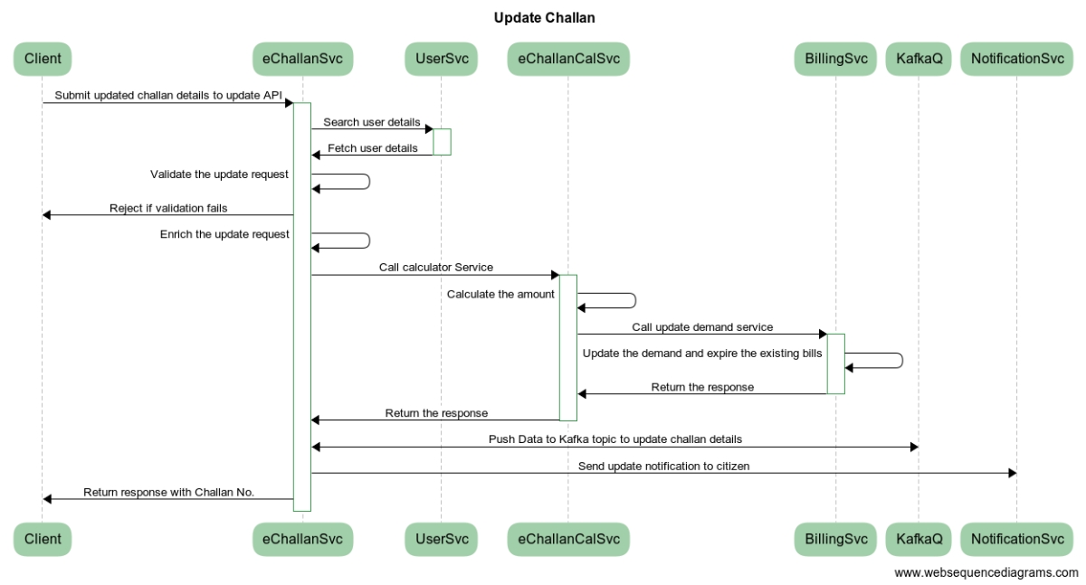 echallan-services/eChallan/v1/_update should be added as the update endpoint. This method is used to update fields in existing records or to update the status of the application based on workflow.
