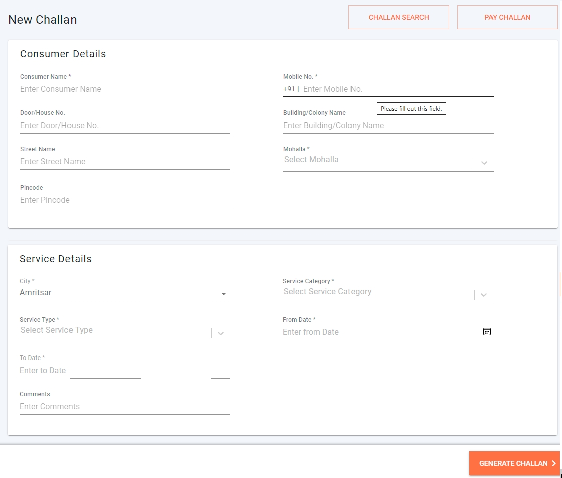 Employees can Create Challan, by selecting the service category, and entering all consumer information and tax head details.