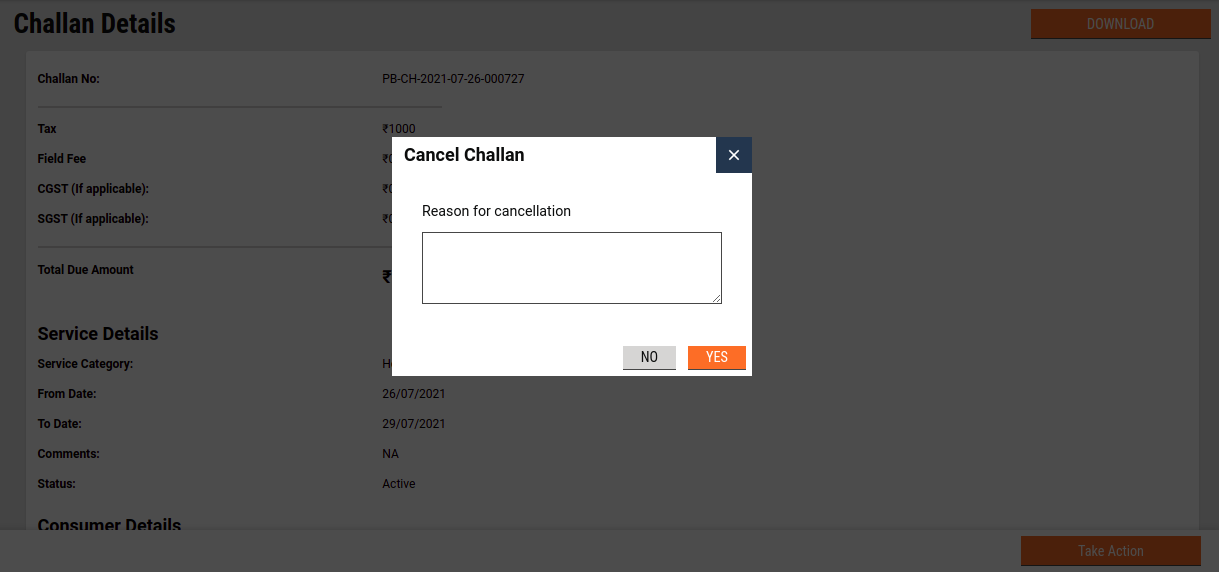 Click on yes, the challan will be cancelled and users will be routed to the acknowledgement screen.