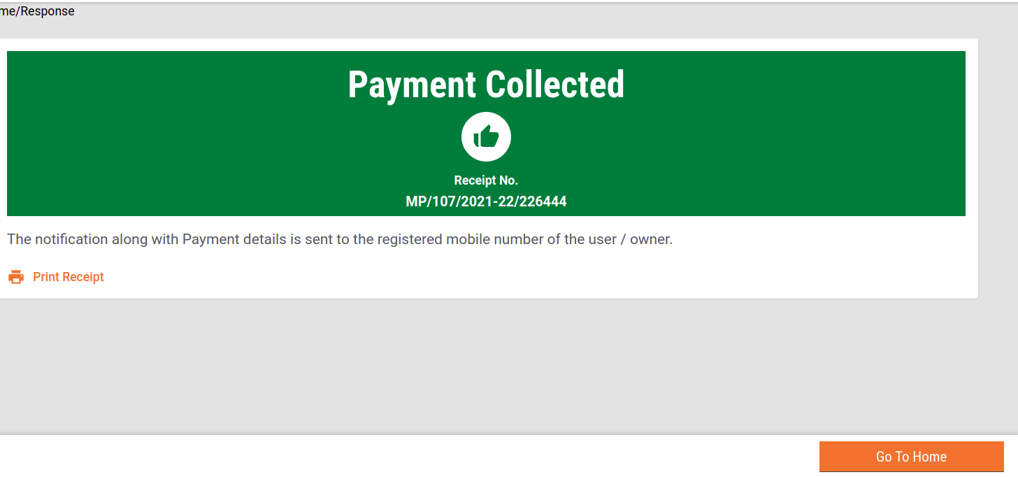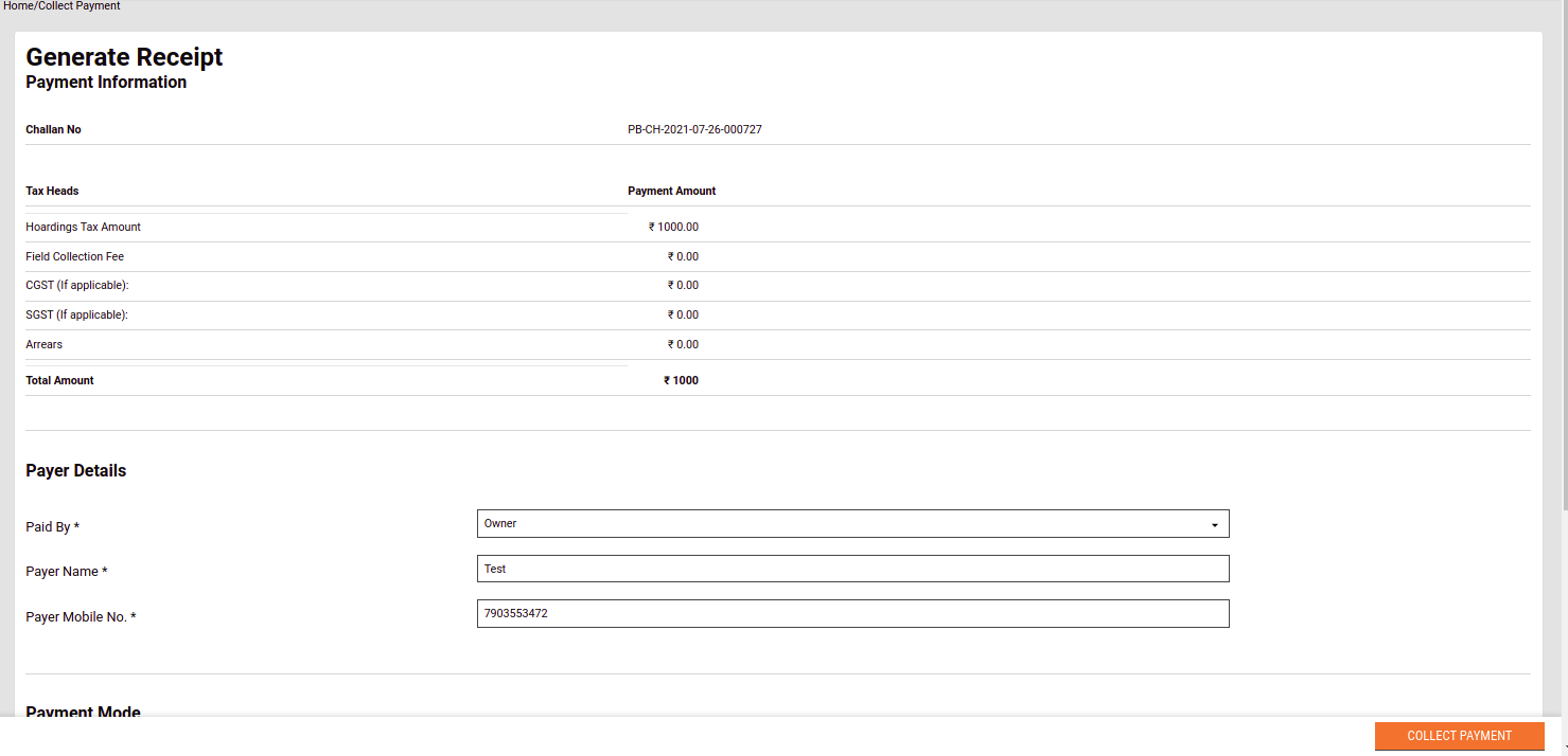 Clicking on the Collect Payment button payment allows users to collect and route to the acknowledgement screen it is common for all modules.