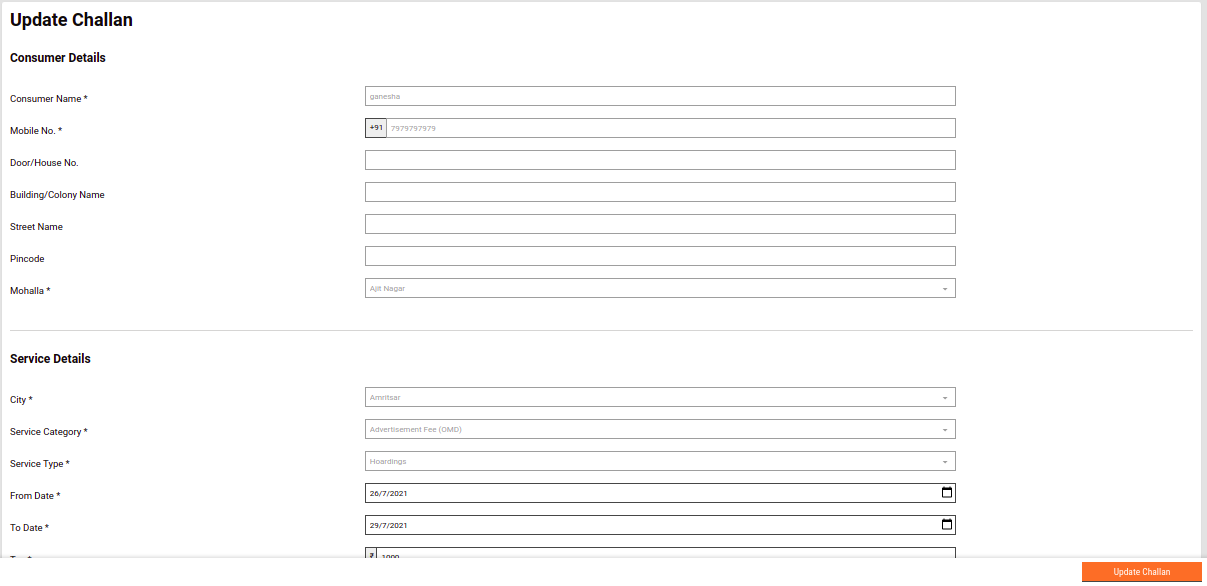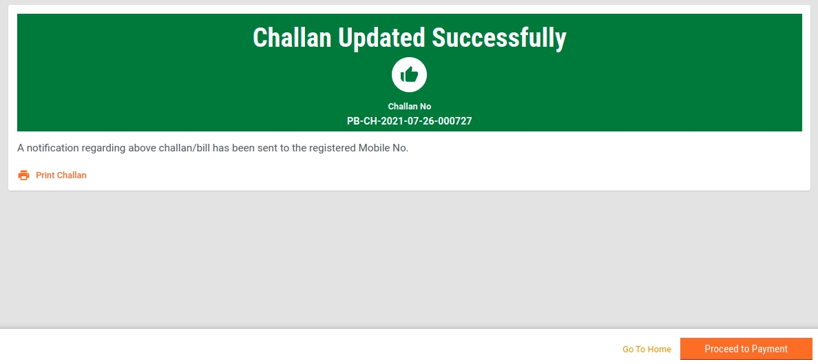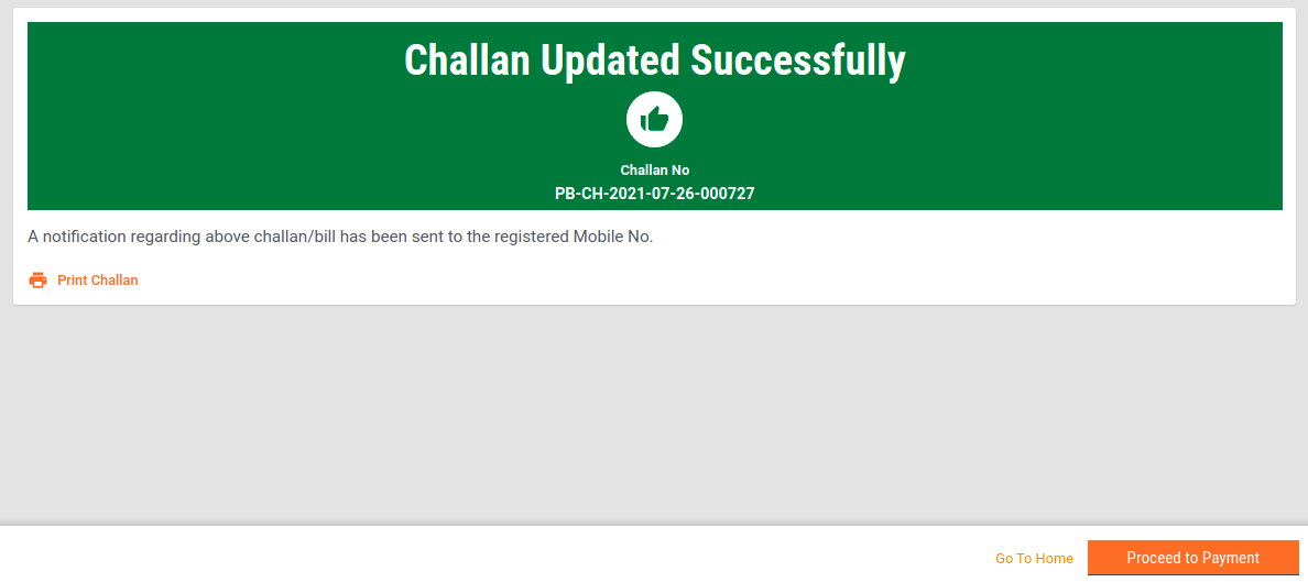 Clicking on the Update Challan option updates and routes users to the acknowledgement screen.