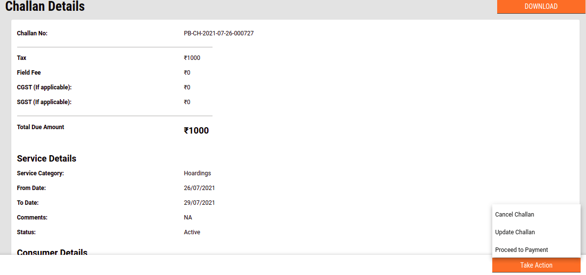 After searching for a Challan with a click on the Challan number it navigates to viewing the Challan details. The view Challan details is mentioned over