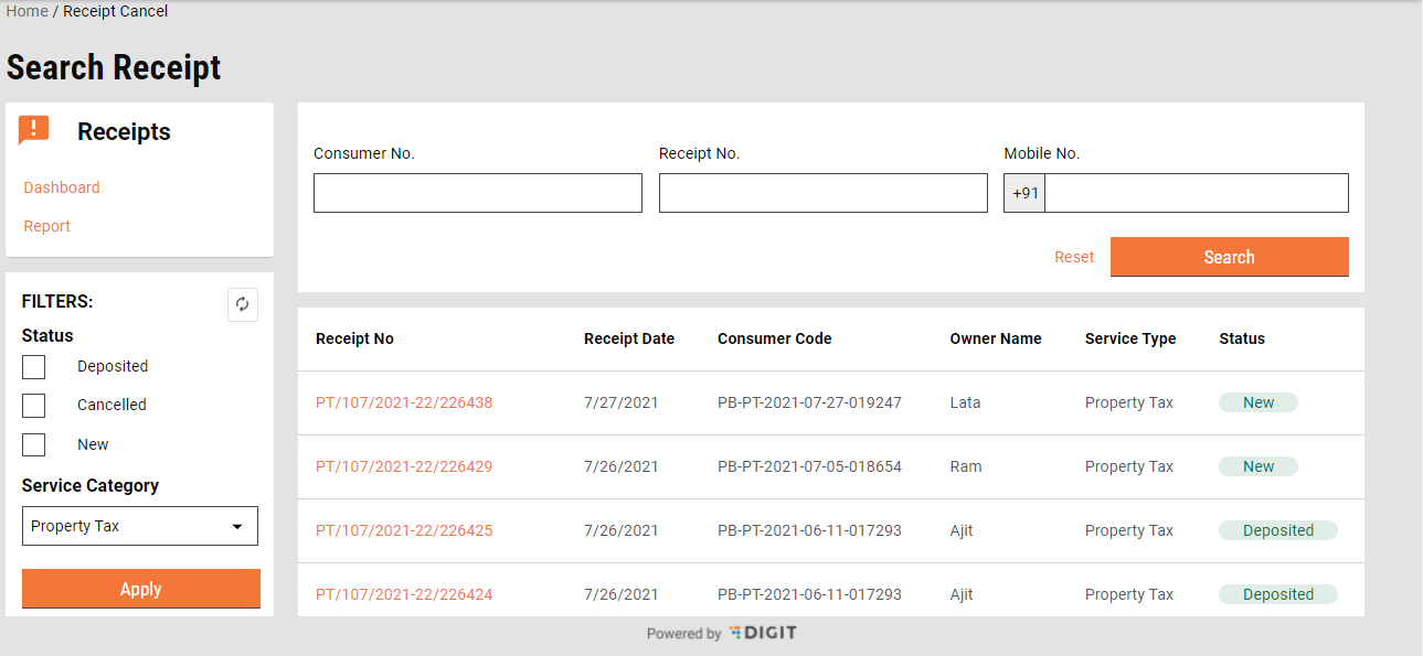 The Search and Cancel Receipts option is available only for enabled services. This is configured in uiCommonPay config by setting true the cancelReceipt.