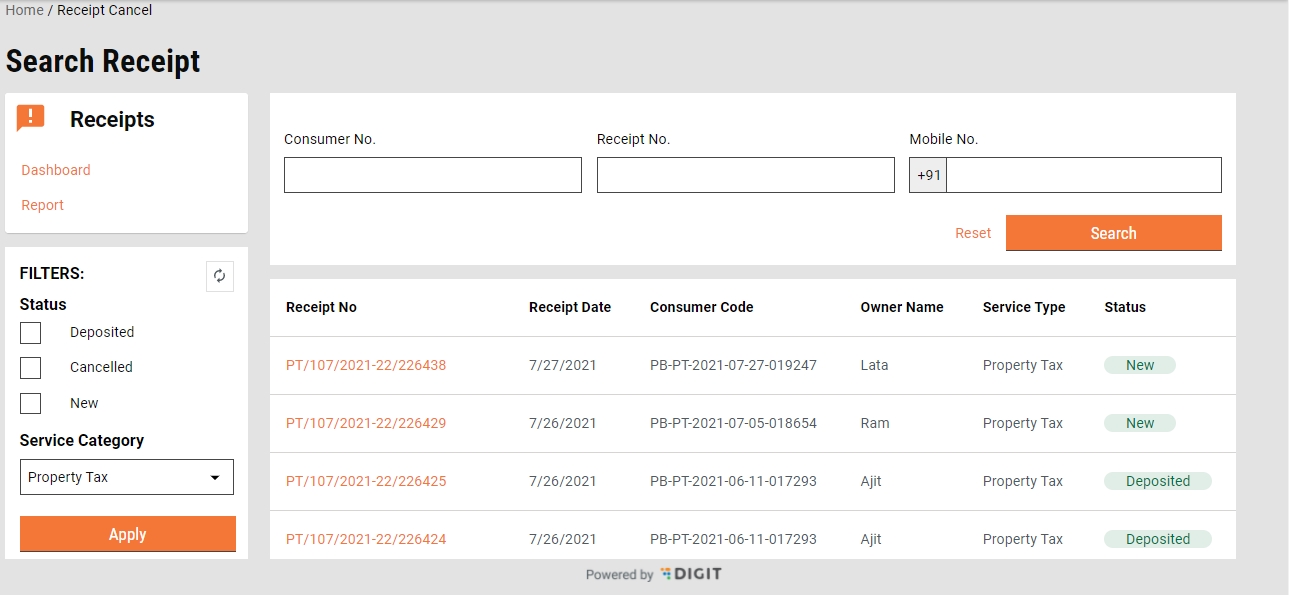 }The Search and Cancel Receipts option is available only for enabled services. This is configured in uiCommonPay config by setting true the cancelReceipt.