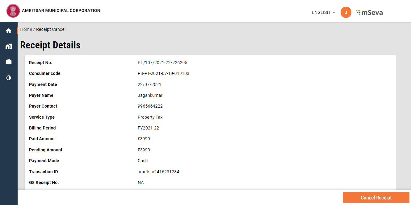Once the Receipt is searched using collection-services/payments/{selectedbusinessService}/_search API, the user can cancel the receipt using /collection-services/payments/{selectedbusinessService}/_workflow API