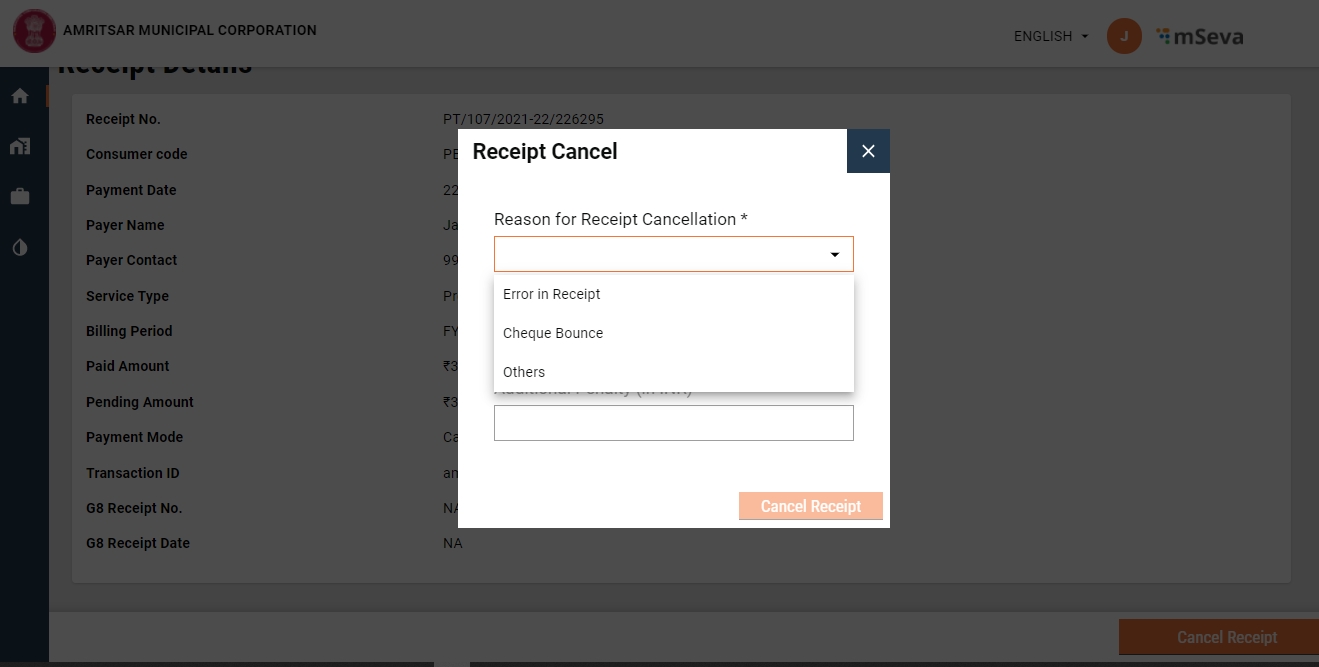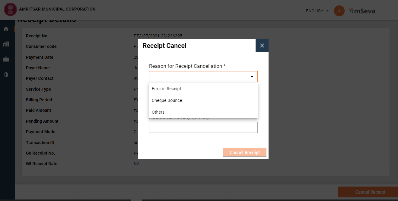 Action modal - This appears with the click of Cancel Receipt. The cancel receipt action is shown only for the following state of receipt.