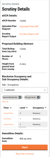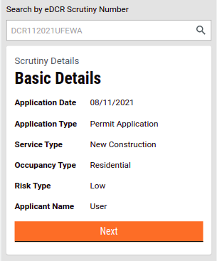Users will need to verify the basic details received from the API, using the eDCR scrutiny number. In case the scrutiny number is not entered, users can enter the number and search for the result.