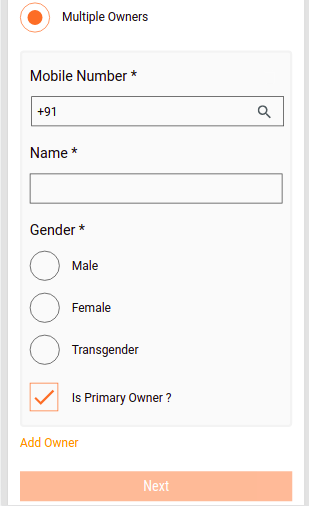 In case, the multiple owner option is selected, the Add Owner button is visible. The Primary Owner checkbox is also available. Click on the Add Owner button allows users to add multiple owners accordingly. Click on the Next button calls the Create API.