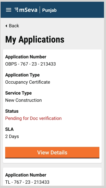 Users can review the list of applications and their status registered using their mobile number on the My Applications page. Each Application initially displays the Application Number, Application Type, Service Type, status, and SLA with the View Details option.