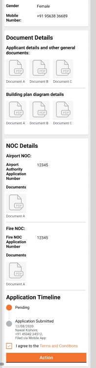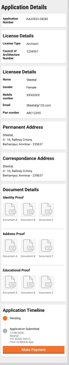 Clicking on the Stakeholder Application card routes the user to the stakeholder application details. The application details page displays the details of the application and also showcases all the actions that can be taken on the application.