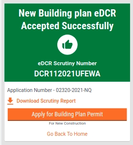 Stakeholders can generate the eDCR scrutiny number by clicking on Plan Scrutiny For New Construction link. They can add all the information, according to the questions asked, after filling in the information in the eDCR form click on the Submit button. This triggers the Create API call. The success or failure of the API routes the user to the acknowledgement screen. If eDCR API is Success => it routes to the acknowledgement screen. Stakeholders can see the eDCR number, application number and download option. If eDCR API is Failure => it routes to the acknowledgement screen. Stakeholders can see the application number and download option but not eDCR number.