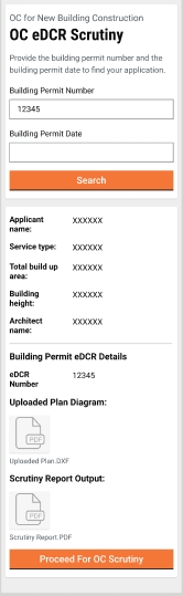 The BPA and eDCR search results display all details regarding the application along with the proceed for OC scrutiny button on a separate card.