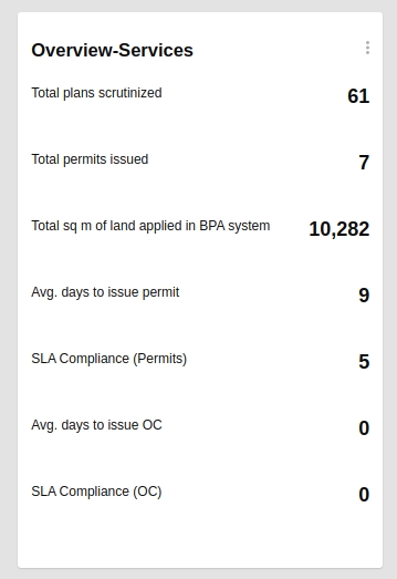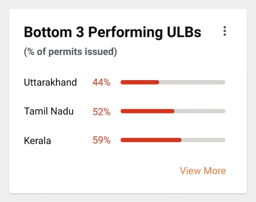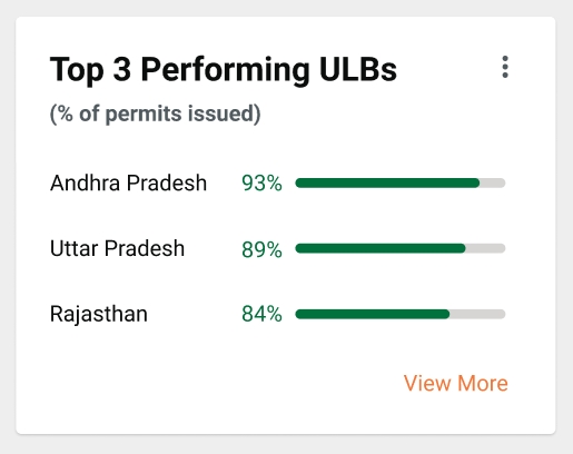 Top 3 Performing ULBs: This card will show the Top 3 Performing ULBs based on the percentage of permits issued. The number of permits issued / Number of applications.