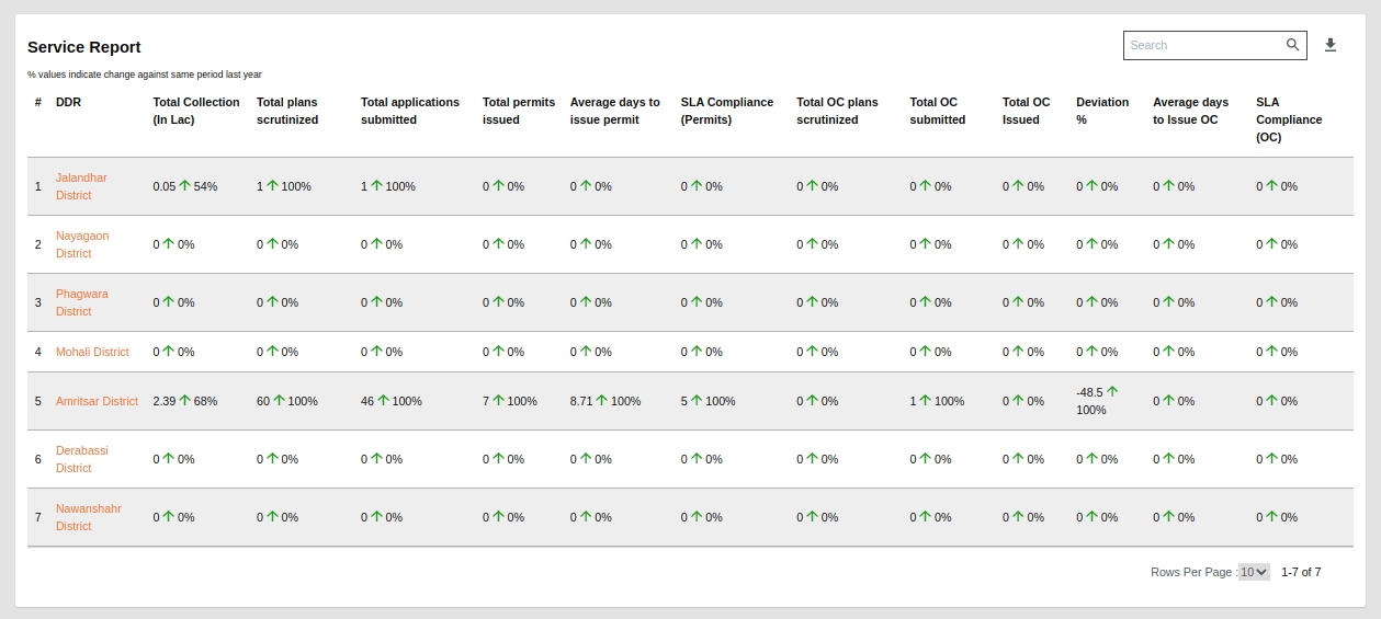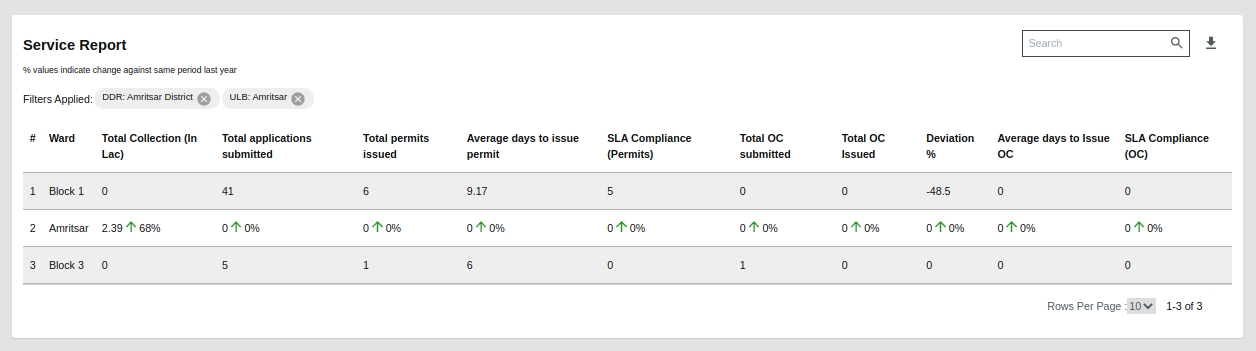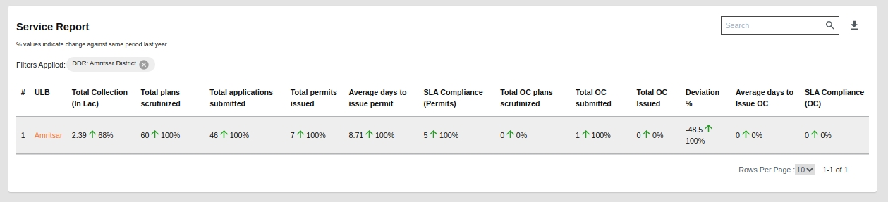 Service Report: This tabular chart representation graph shows information about multiple OBPS-related categories like Total Collection or Total Cumulative Collection, Total Plans Scrutinized, Total applications submitted, Total permits issued, Avg. days to issue a permit, SLA Compliance (Permits), Total OC Plans scrutinized, Total OC submitted, Total OC issued, Deviation Percentage, Avg. days to issue OC, SLA Compliance (OC), Total OCs with deviation. This table also shows the data at the state level and also has the drill-down chart for each state to ULB and from ULB to ward level data for the same.