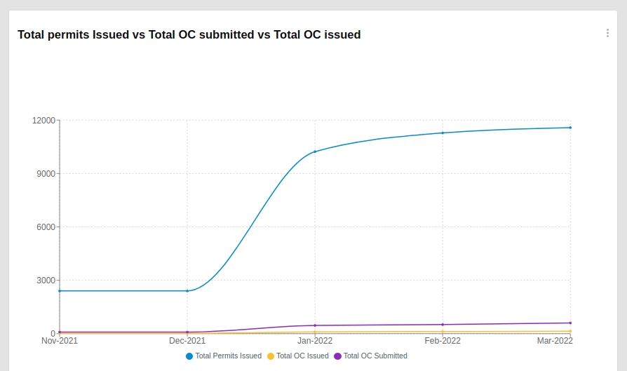 Total permits issued vs Total OC submitted vs Total OC issued: This graph shows the total permits issued vs total OC submitted vs total OC issued for a given time period in the form of a line chart.