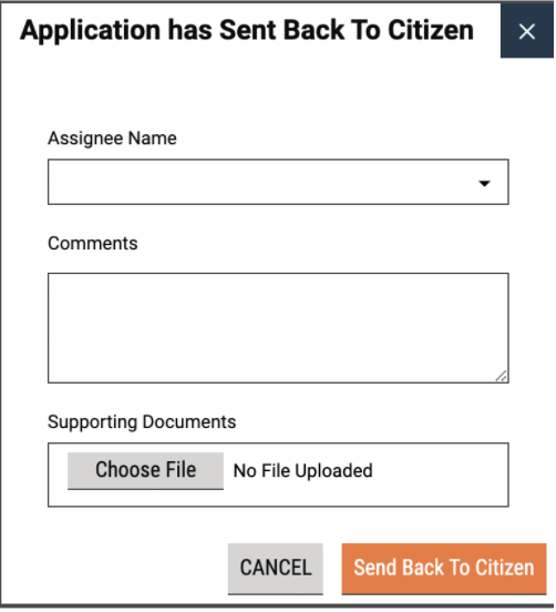 Click on the Choose File button to upload any supporting documents. Click on the Send Back to Citizen button.