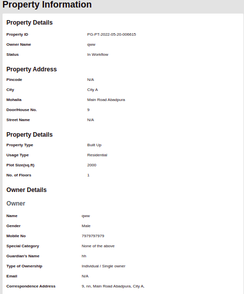 Once the user enters all required details, the form redirects the user to the list of all properties registered with the property id or as per the search parameters entered by the user