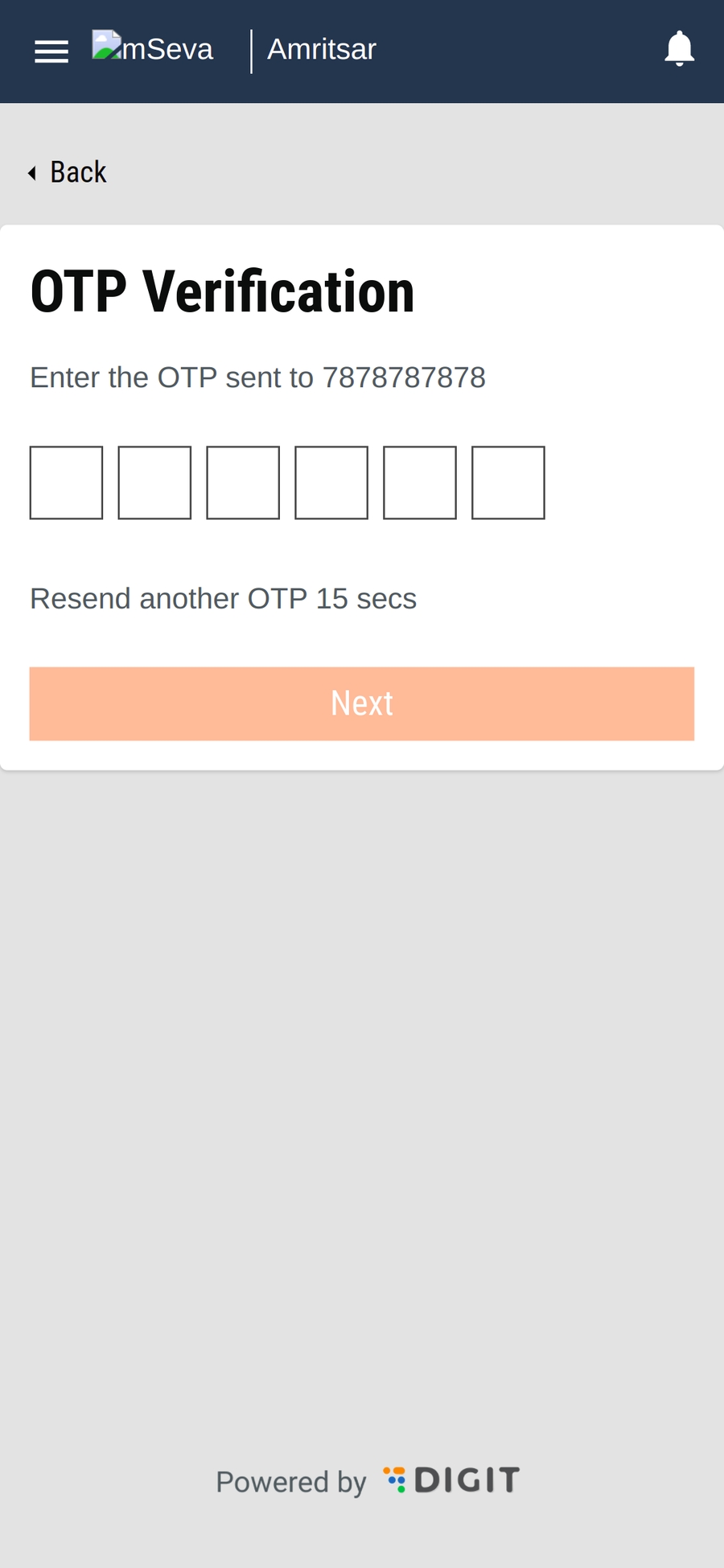 Clicking on the Select button redirects users to the OTP verification page. Users must enter the OTP sent on their mobile number to proceed further.