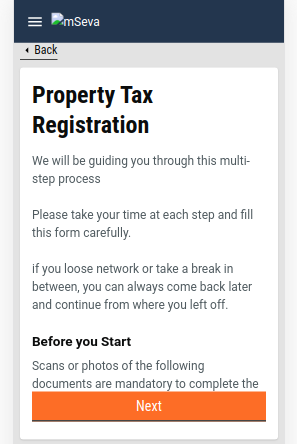 Property tax registration information screen is displayed after login. This helps the user identify the required documents to complete the new registration for the property.